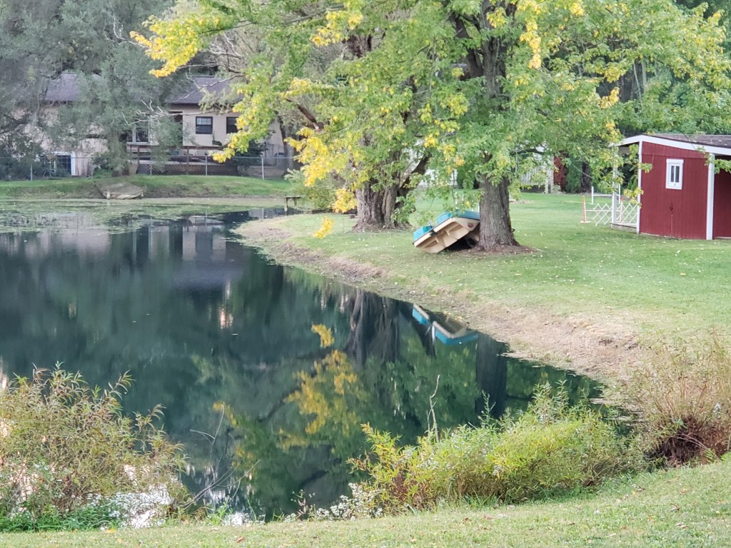 We go “to the hill” nearly every day. It’s beyond the pond and looks over the other acres. I can see the horses two houses down and the neighbors back fields. It’s quiet… it’s pretty. The dogs can be let off lead… well really only Jake is on lead and I take it off when we are at the hill. He took off and ran down the fence to chase the neighbor’s dogs – up close and personal like. Ever since that happened – I am more vigilant. He and Lukas though love to run and smell the field. They sometimes head to the back of the field… and that’s just fine. It wonderful watching them enjoy the outside. Does my soul well! Kaiden chases his ball! He lives to do that… I can chuck that ball a good distance and he chases it like a “bat out of hell!” He brings it back and we do it again… and again… and again! Sometimes – Jake will bomb dive him! He uses all his weight and throws himself towards Kaiden. Kaiden just dodges him… and keeps running! Lukas loves to play too… he can’t outrun Kaiden so I will hold Kaiden and throw it so Lukas can see it and catch it on a bounce or two. I let Kaiden go then… Lukas brings it back and I tell him – “It’s Kaiden’s turn now!” This goes on for some 20-30 minutes. We then walk back to the house… now without Jake on lead. They stop and walk the banks of the pond and then into the yard.